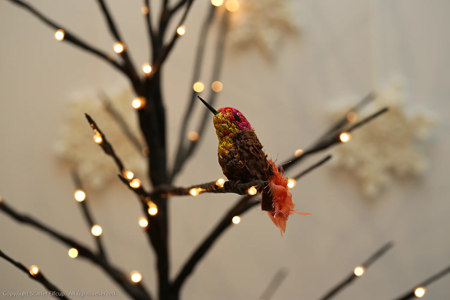 Scarlet Elfcup's hummingbird creations are life-sized. The birds range from 3-5 inches (approx. 7-12 cm) long from beak to tail and stand at about 1 inch (about 2 cm) tall. Each bird is decorated with nearly 1000 hand-embroidered stitches covering the body. And because these birds are hand sewn from start to finish, it takes nearly 30 hours of finely detailed needlework to complete one bird.